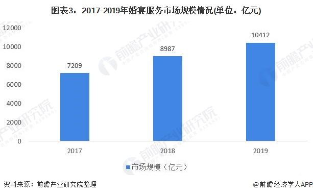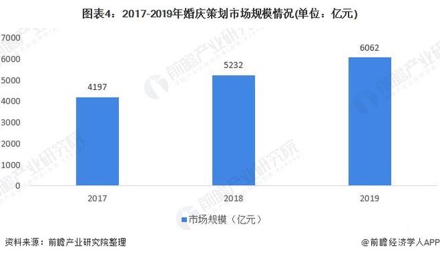 據(jù)統(tǒng)計(jì),2019年我國(guó)婚慶整體市場(chǎng)規(guī)模為21120.3億元,同比增長(zhǎng)15.85%。其中婚慶策劃占總市場(chǎng)規(guī)模比重為28.7%,故前瞻估算2019年我國(guó)婚慶策劃市場(chǎng)規(guī)模近6062億元。