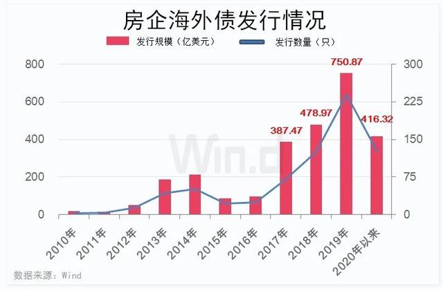 Wind數(shù)據(jù)顯示,截至7月21日,房企境外發(fā)債規(guī)模已經(jīng)達(dá)到416.32億美元(約合2910.45億元),已經(jīng)超過2017年全年規(guī)模,且接近2018年全年規(guī)模。