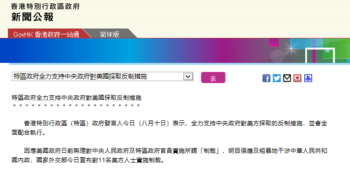 香港特區(qū)政府:全力支持中央政府對(duì)美方采取反制措施