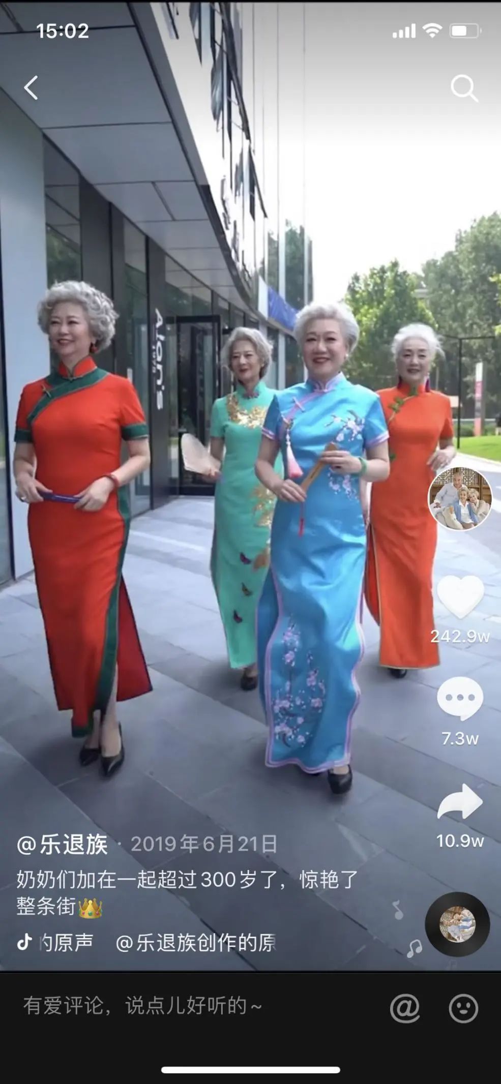 2019年初,樊其揚和“銀發(fā)閨蜜團”另外三位老姐妹穿著旗袍在北京三里屯街頭走秀,伴隨著古風音樂,她們搖扇走過,銀發(fā)、節(jié)奏、眼神、氣場無兩,短視頻一夜之間成為抖音爆款,獲得了242W點贊量。她們也從素人成了銀發(fā)網紅。