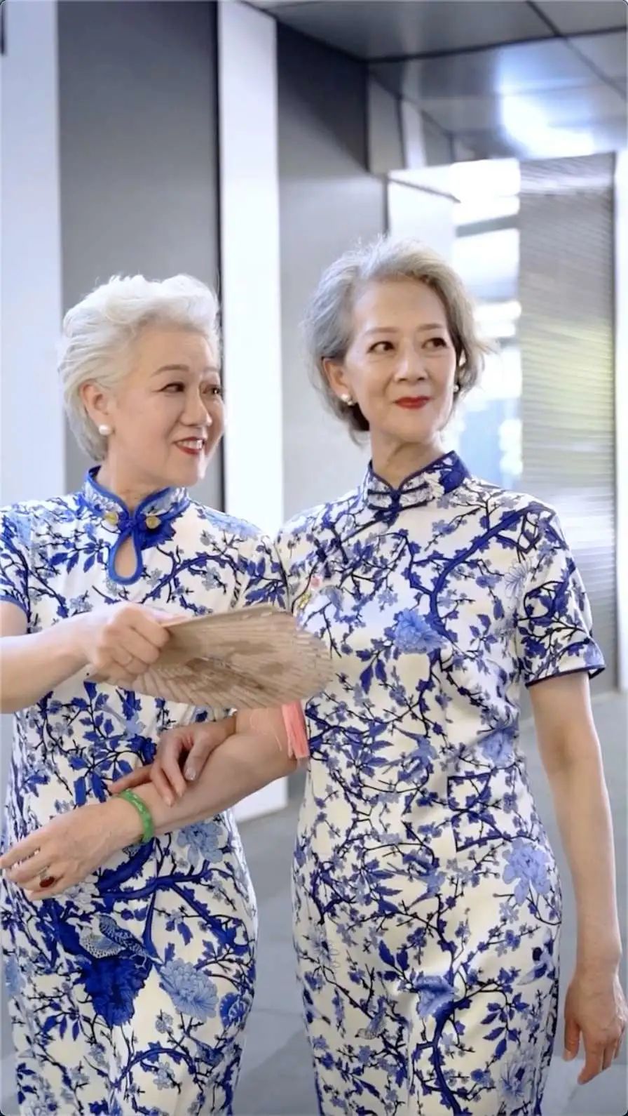 樊其揚一襲黃色長裙,銀色中發(fā),典型的巴掌臉,眉宇清秀。李俊蘭著深色長款旗袍,眼神深邃、五官立體,一頭格外豐茂的銀發(fā)讓人想起英格麗·褒曼的短發(fā)造型。