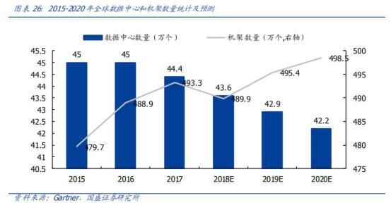 總的來看,全球數(shù)據(jù)中心的集中度在顯著提升。據(jù)Gartner測算,2015年-2020年全球數(shù)據(jù)中心數(shù)量將從45萬個下降至42.4萬個,但機(jī)柜總數(shù)卻由479.7萬個提升至498.5萬個,形成剪刀差。