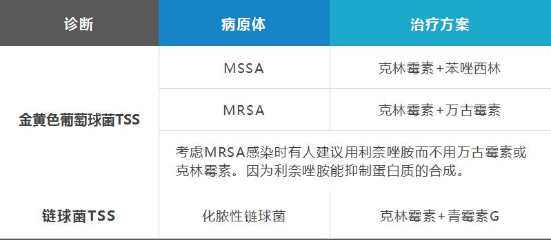 國外關于TSS患者經(jīng)驗性抗感染治療方案首選克林霉素+萬古霉素+青霉素。