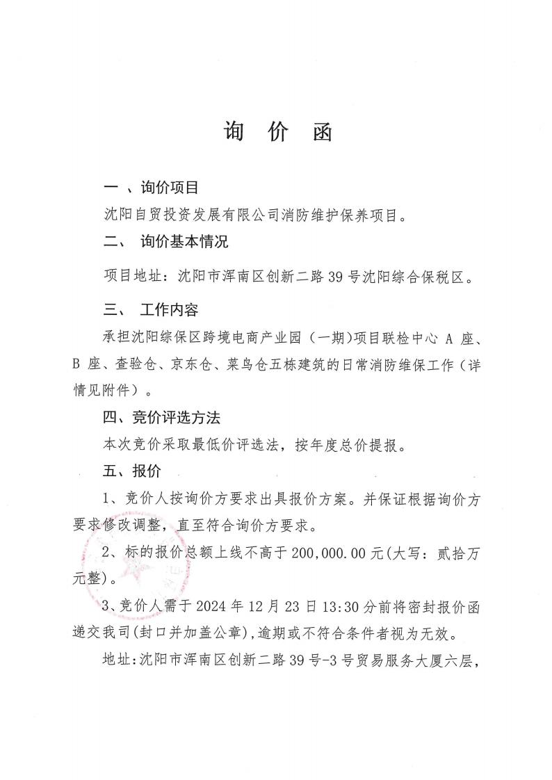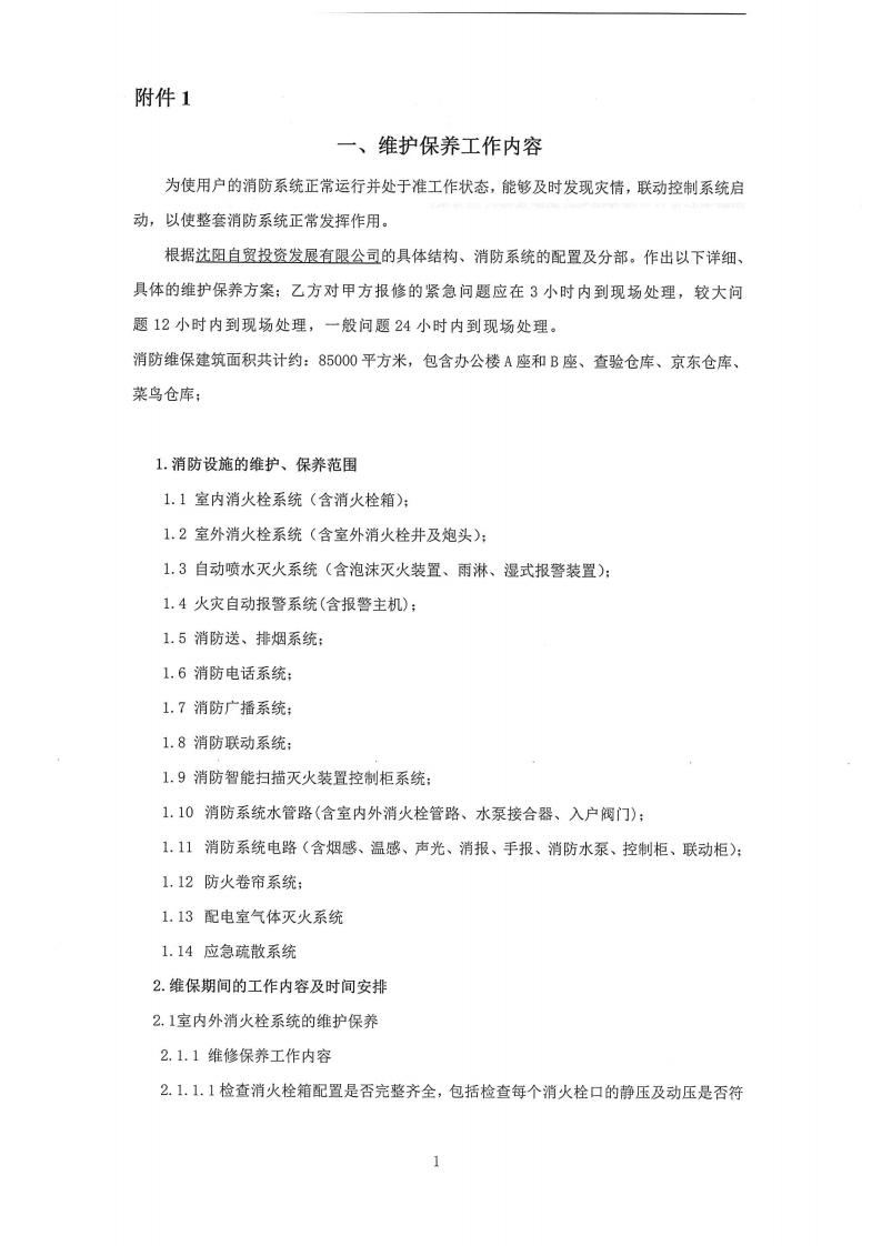 附件1: 沈陽(yáng)自貿(mào)投資發(fā)展有限公司消防維護(hù)保養(yǎng)詢價(jià)項(xiàng)目
